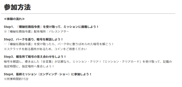 本次與「UNIVERSAL COOL JAPAN 2023」企劃中,為一場「SPY×FAMILY Secret Mission」的解謎秀,也是《間諜家家酒》首次將作品化為互動式遊戲體驗!遊客將會在入場後得到佛傑一家提供的「極秘任務指令書」,之後就在園區內找出謎團與解出暗號。在指定時間內解出謎底後,回定指定場所集合,欣賞故事完結的解謎秀。