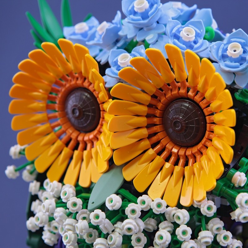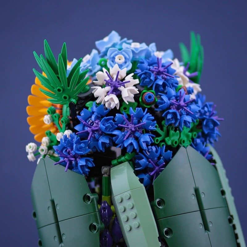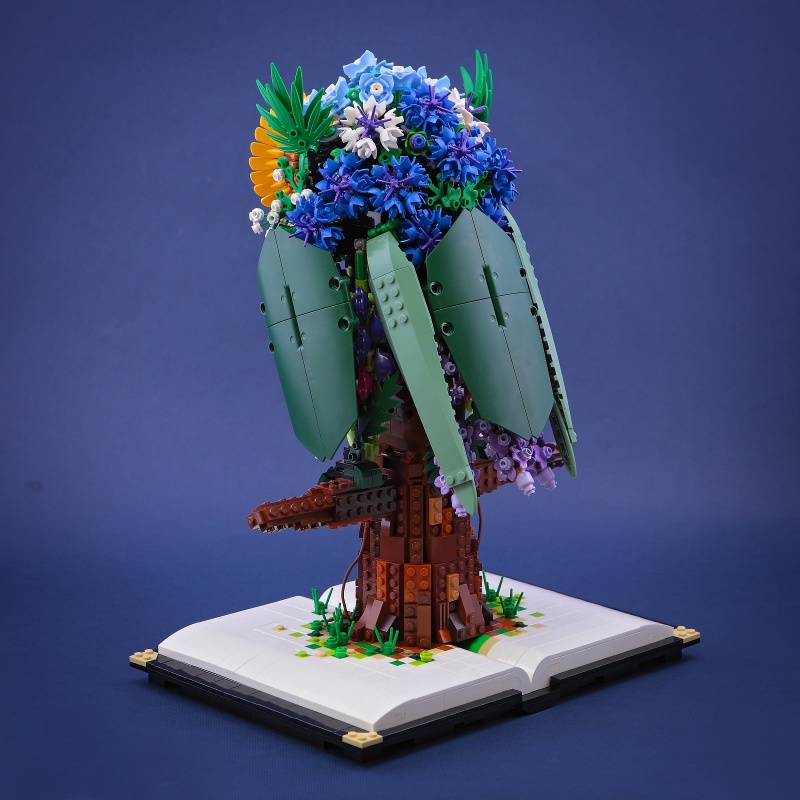 這次的「花卉貓頭鷹」大約用上 1800 片零件,可說是將「10313 野花花束」裡頭的花朵以不同的組合樣式趣味呈現,包含用以表示貓頭鷹大眼睛的非洲菊、胸口羽毛的峨參跟魯冰花、頂部的翠雀花,以及轉到背面可以看到的矢車菊、薰衣草構成的尾羽,頭部兩側翹翹的羽毛則是利用常見的棕櫚樹葉片零件表示,翅膀部分就以較為大片的綠色科技零件組成(推測是來自「10289 天堂鳥」那一盒),形塑出大小不一的層次感,整體擁有很高的造型密度與繽紛色彩。
