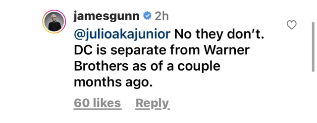最近,有網友在Instagram留言處質疑,儘管岡恩看似一手掌舵了DCU的未來大局,但這難保不會再受到華納兄弟高層的干涉。對此岡恩回覆聲明:「不會了。DC已經在幾個月前 (意即其上任後) 與華納兄弟一分為二了。」