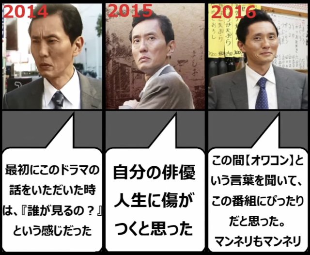 2015:我認為演出這個角色會對我演員人生造成傷害。(其實他的意思是說演出五郎的時候只是呈現好吃、而不是發揮自己的演技,想必他是很希望能以高超的演技受到認可的。)