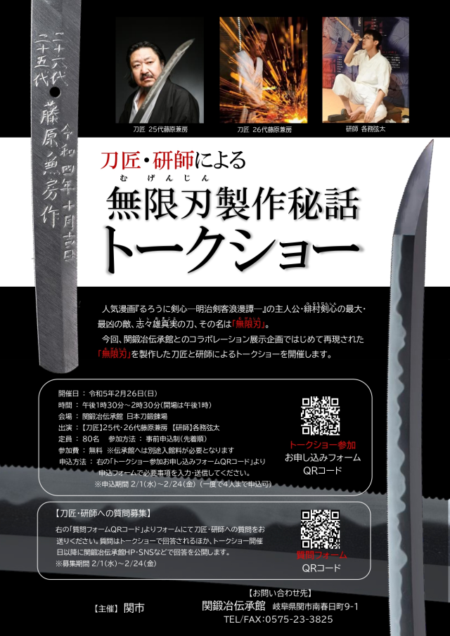 展覽所在地的岐阜縣關市,被譽為「世界三大刀物産地」,不僅是歷史悠久的製刀聖地外,該處的工匠更是日本歷史製刀的瑰寶。這次選擇在這裡舉辦,也是希望藉此推廣喜愛日本刀的世界粉絲一起來朝聖。而這次展出的最大看點,就是由關市製刀名家-藤原兼房刀匠的 25 & 26 代親子共同製作的志志雄愛刀「無限刃」實體將會展出,給所有愛刀之人與作品粉絲一飽眼福。
