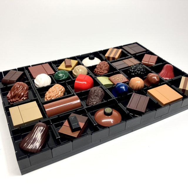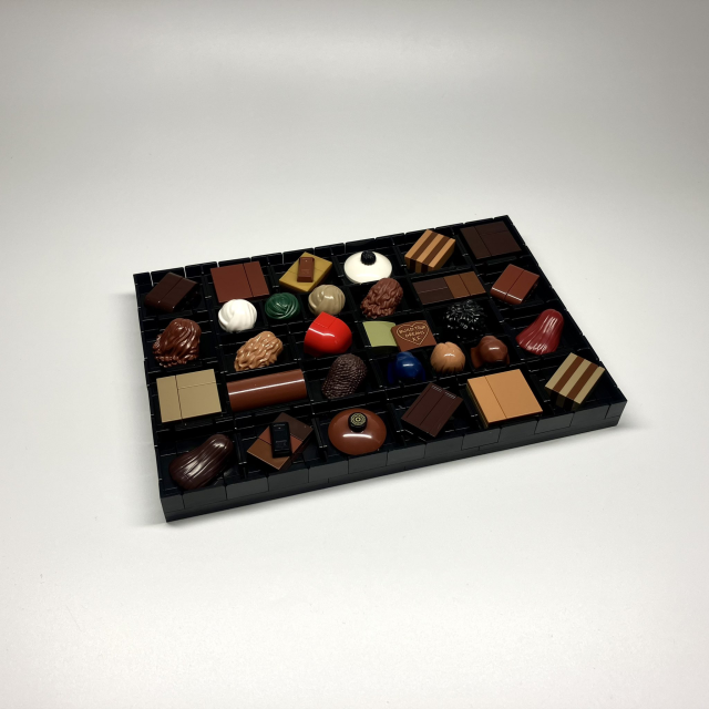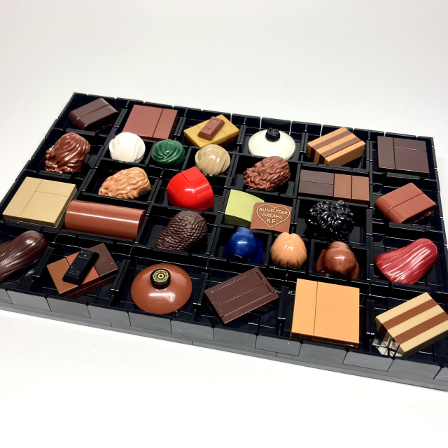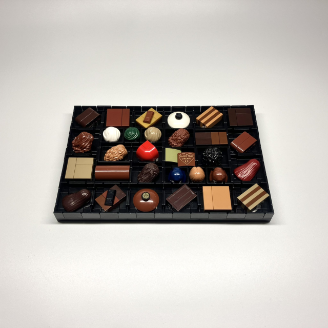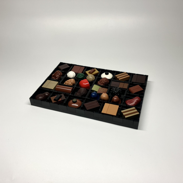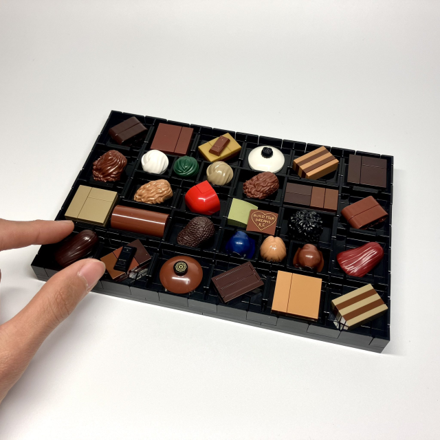でんのすけ參考了各家巧克力盒裝的樣貌,將各種樂高零件用盒裝的方式呈現出巧克力盒的效果,可以看到上面像是巧克力的零件其實都是樂高各玩具的分件,有些是人物的頭髮,有些是道具,又或者是組裝的分件。