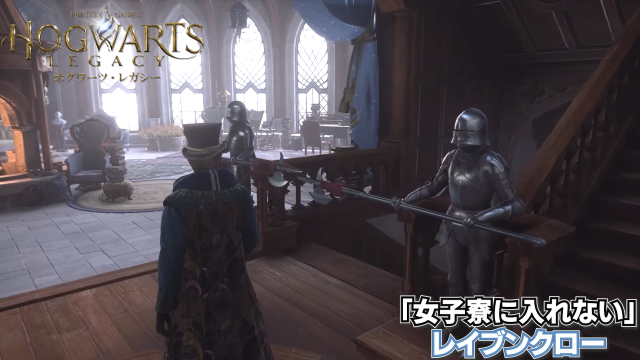 除了赫夫帕夫以外,像史萊哲林、葛萊芬多也是一樣的狀況,唯獨雷文克勞不太一樣的「阻擋方式」,是以左右兩旁的鎧甲,以長戟雙雙阻擋男主角的去路,甚至我們可以從日本玩家於YouTube上分享的影片中,也能夠看到即使用了隱身咒語,也依然騙不過兩尊鎧甲。