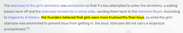 當然,這個細節也是有所根據的,因為在《哈利波特》系列原著小說中就有提到:霍格華茲創辦人認為,女學生比男學生更值得信任,因此男學生無法進入女生宿舍,也算是還原原作的部份了。