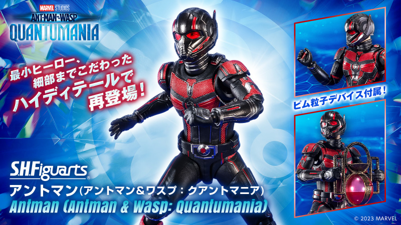 「S.H.Figuarts 蟻人(蟻人與黃蜂女:量子狂熱)」可動人偶,根據電影《蟻人與黃蜂女:量子狂熱》的設定,以全新戰衣的姿態再度回歸,仔細還原經典的紅黑配色、胸口位置的圓形構造以及頭盔等造型細節,從頭盔的紅色鏡片透出史考特·朗恩的頭雕,從雙眼間就能感受到演員保羅·路德 (Paul Rudd) 的神韻。另外更搶先公開有拿著皮姆粒子膠囊的替換手腕、電影中登場的飾品等配件。