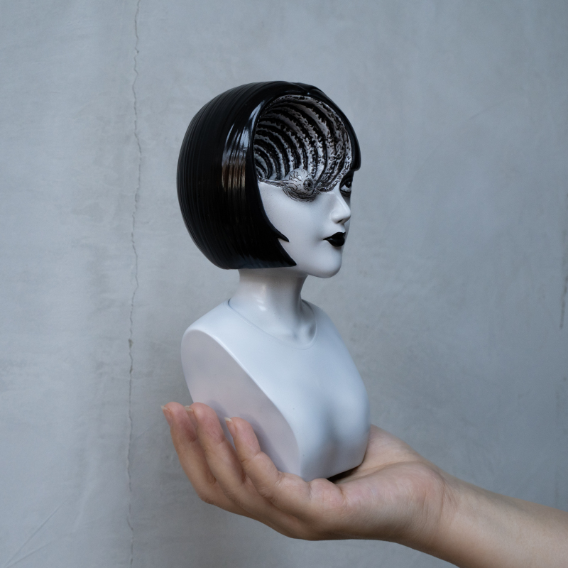 這一次立體化的兩款胸像高度皆為 16 公分,原型部分再度請到日本特殊造形作家「万凛」操刀,先從短髮少女「黑谷薊」開始看吧~不只是將被漩渦吞噬的右邊額頭深刻再現,內部彷彿吞噬了皮肉的漩渦紋理與細緻筆觸互相結合之後,傳達出一股令人感到強烈不安的獵奇氛圍,狀況依舊完好的左眼與整顆眼球外露、遍佈血絲的右眼更是形成猛烈的對比,搭配類似 UNBOX 官圖所呈現、帶點撲朔迷離感的攝影方式,絕對可以將黑谷薊的魅力最大限度呈現!