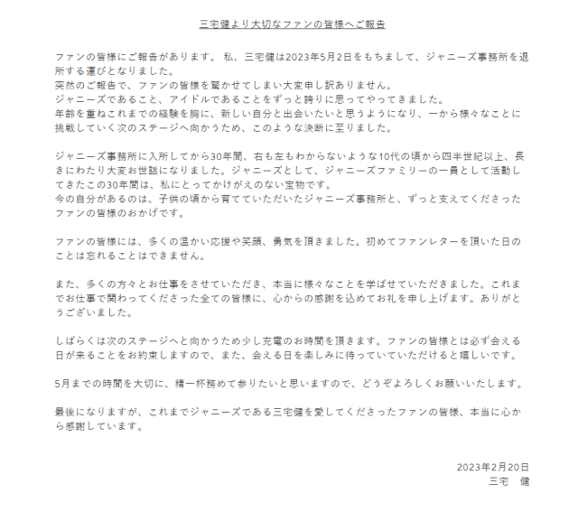 這是在2023年2月21日凌晨,三宅健於傑尼斯事務所官方所發布的正式消息,表示隨著年紀的增長,覺得是時候該往新的目標前進,迎接屬於自己不一樣的人生經歷,因此便決定結束與經紀公司30年的合作,並在2023年5月2日這天離開傑尼斯事務所。