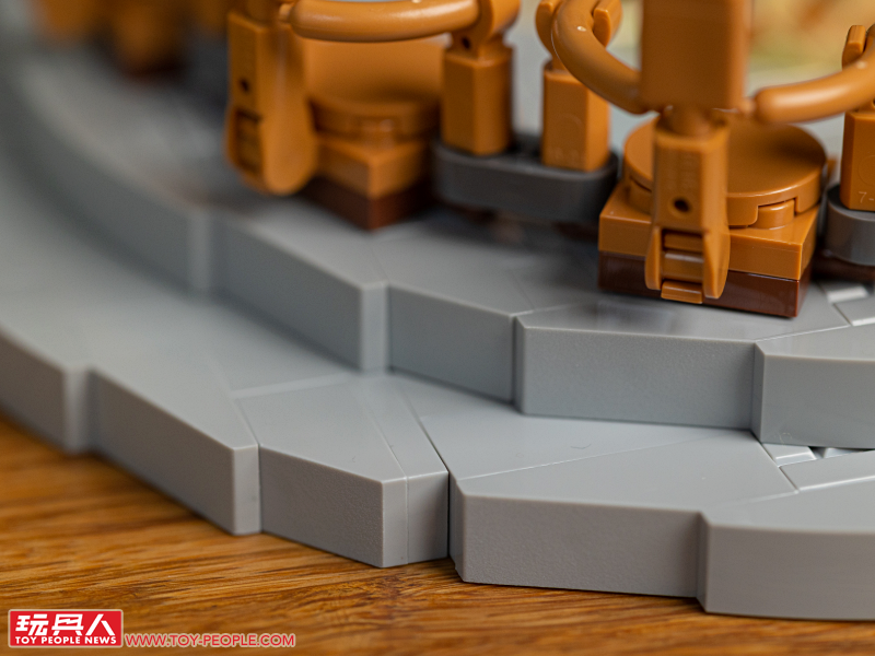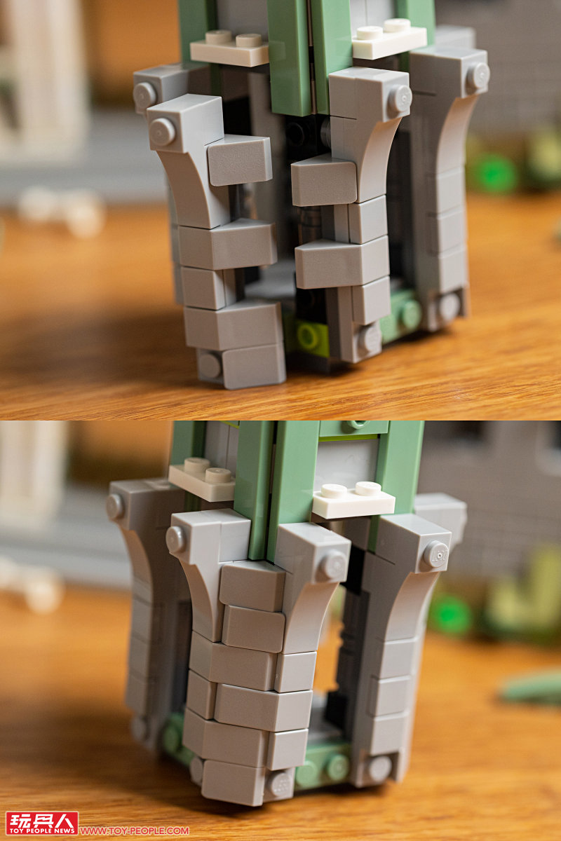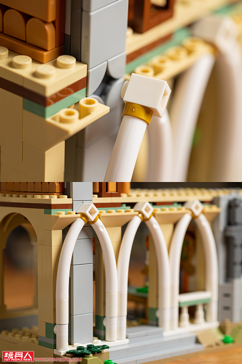 ▼ 那我們就按照慣例,先看看組裝過程中的驚喜之處吧~首先是拱形尖端顆粒與牆壁固定的方式,牆壁部分採用 4 個 ¼ 圓所形成空間剛好可以扣住樂高的顆粒,超級巧妙。