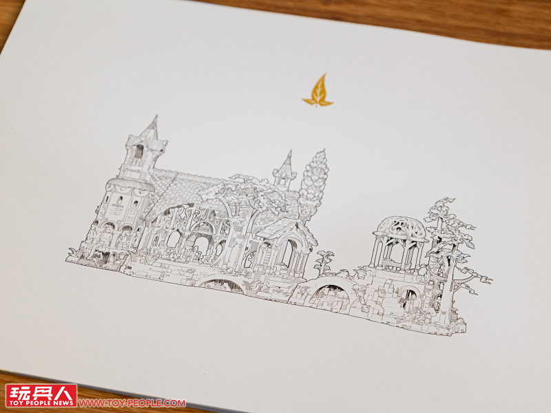 ▼ 拆開之後的內容物共有三本說明書、兩張貼紙,以及滿坑滿谷的零件;說明書相當有質感,不只採用白色底襯托樂高瑞文戴爾的線稿,每一本對應的組成部分還特別以素描的方式呈現,順序的話可以參考右上角的金色精靈葉片(Leaves Of Lorien)符號。