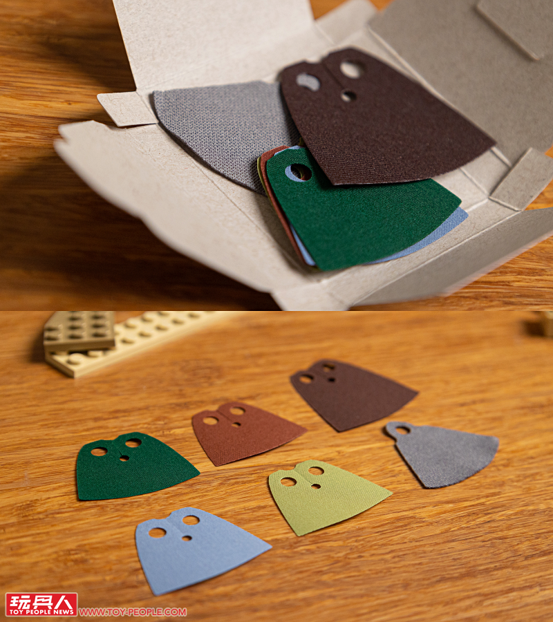 ▼ 與人偶搭配的布料披風被紙方盒好好地收納,一共有六件披風,四位哈比人各一件、波羅莫一件,甘道夫的灰披風則是不會有摺痕、更軟的布料。