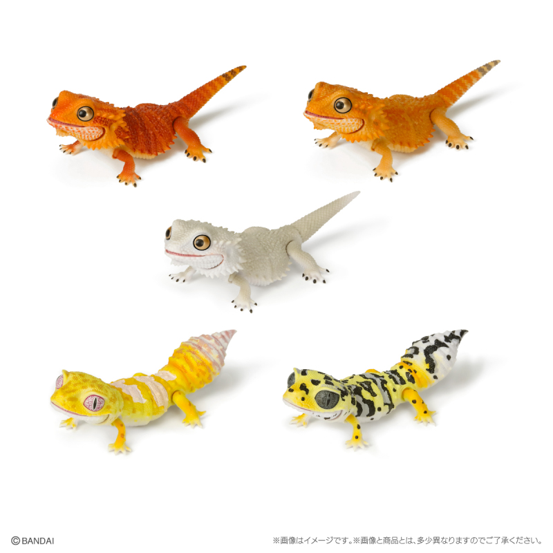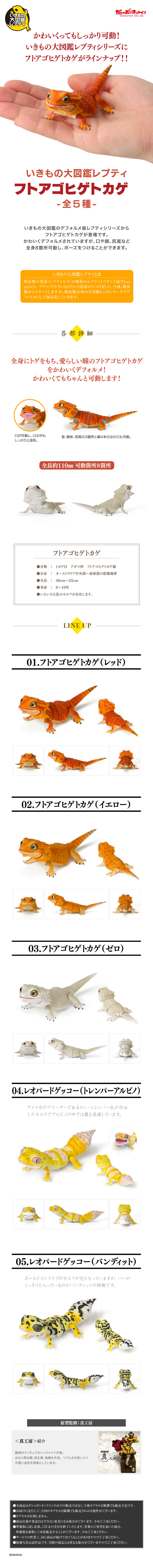 以普通版本推出的「生物大圖鑑Repti 鬆獅蜥」環保轉蛋,收錄有鬃獅蜥(紅)、 鬃獅蜥(黃)、鬃獅蜥(白),另外還有豹紋守宮(Tremper Albino)、豹紋守宮(Bandit)一共五種款式,尺寸約全長110mm,並有 8 處可動關節。將鬃獅蜥臉頰與下巴的棘狀鱗片、平坦的體型等特徵還原,加上一雙呆萌眼睛~放在手心上簡直太可愛!