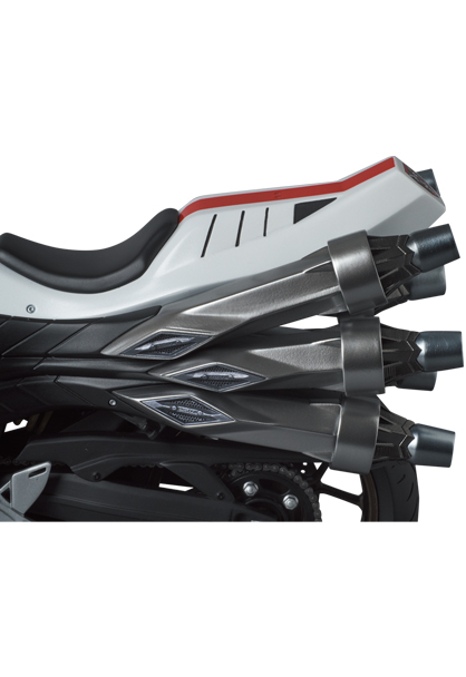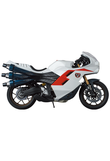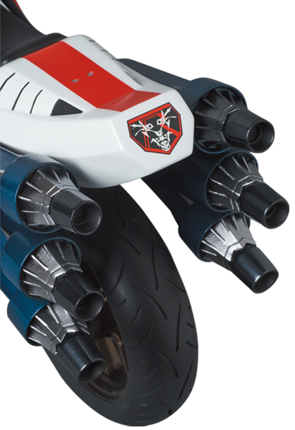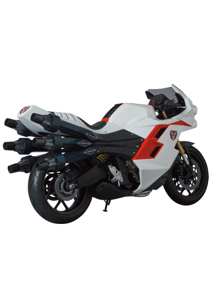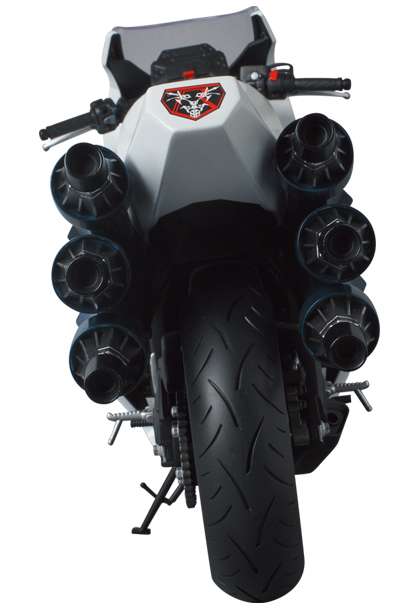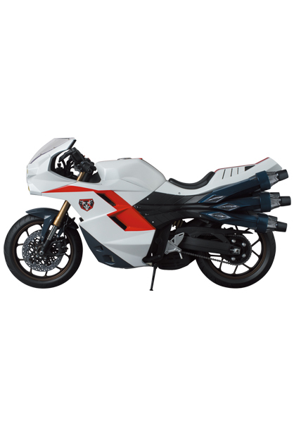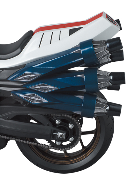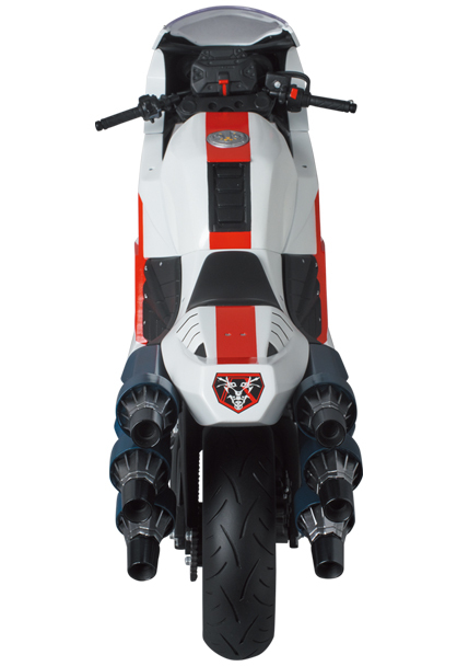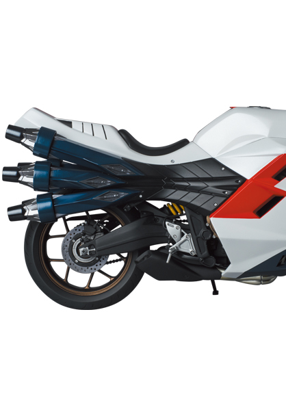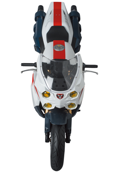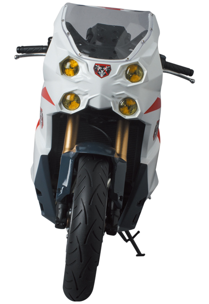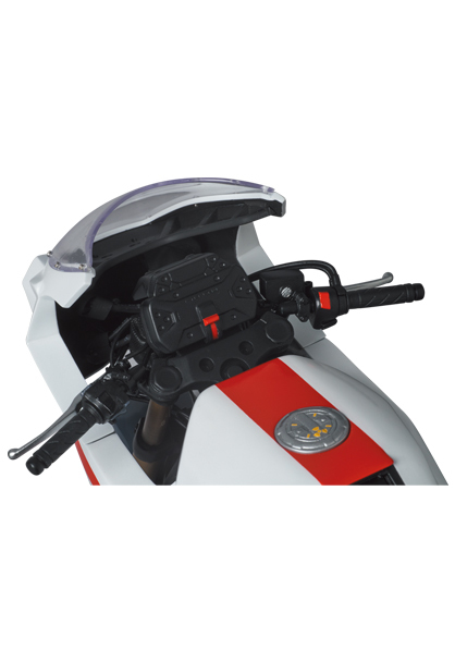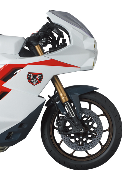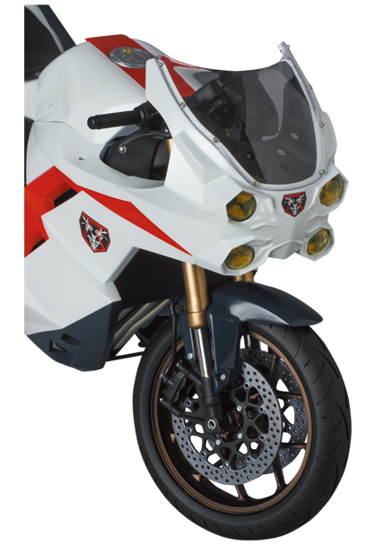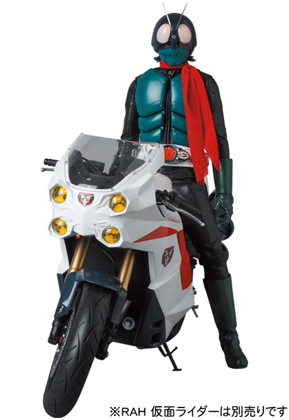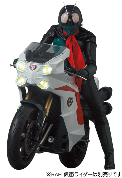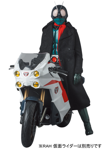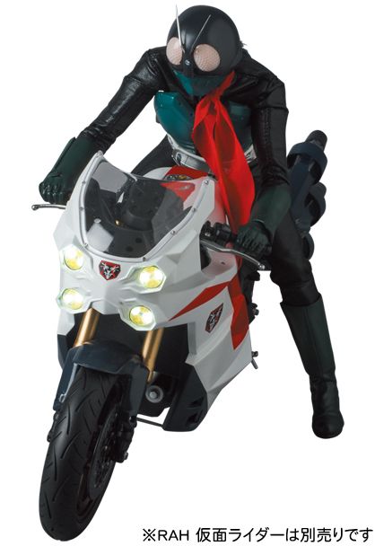 「RAH 旋風號(新・假面騎士)」,尺寸全長約 33 公分,再現新劇場版中重新設計的假面騎士專屬機車-旋風號(Cyclone)造型,前後輪使用可轉動、轉向的可動規格,並精密還原車身各部分的細節、紋理以及經典的立花機車俱樂部 LOGO 等,在車輪框與六支排氣管等處施以質感的金屬色澤;具有特色的四頭燈內置有 LED 光效,大大提升整體氣勢!除了支架外還附有握把替換手勢,可以搭配 RAH假面騎士1號賞玩騎乘飆風的帥氣模樣!