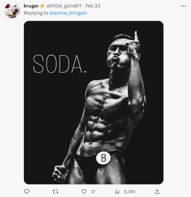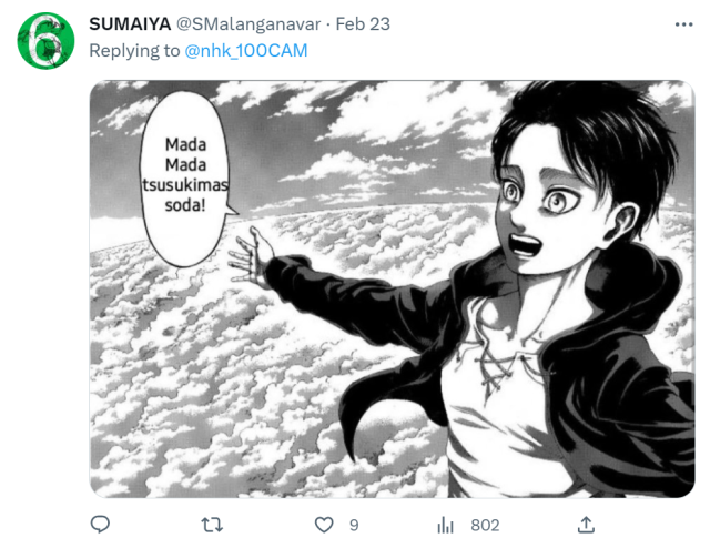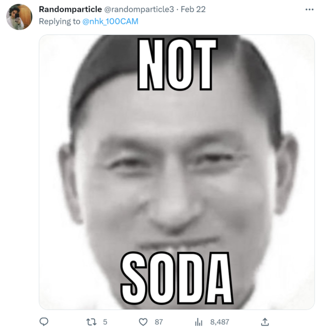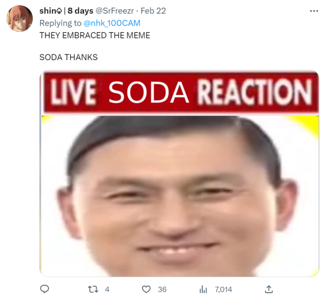 不僅播出的 NHK 電視台的節目推特,連巨人動畫官方推特的宣傳留言底下都湧入了大量的海外網友留言所謂「SODA MAN」的迷因圖,日本網友也好奇到底為何春日會被海外所迷因化。