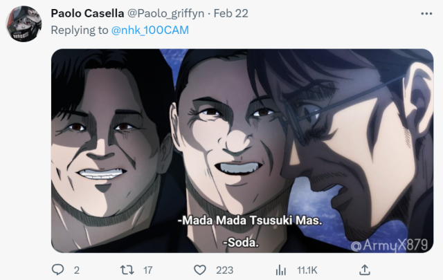 其實之所以會有這個迷因梗,是因為當初節目釋出的預告影片中,最後落林與春日兩人最後的一句話 : 「まだまだ続きます、そうだ 」,就這樣意外的流傳到海外討論區,成為網路迷因,而這次節目組也在官推上打上 SODA,讓不少海外粉絲感到意外也驚喜。