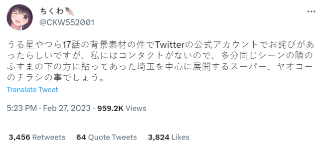睽違 30 多年居然推出新作動畫的《她來自煩星》,想必不論是老粉新粉都十分驚訝,持續熱播中也讓不少年輕人重新認識這部經典作品。不過近期播出的《她來自煩星》第 17 話中,動畫裡使用的背景素材遭到日本繪師指控未經告知就挪用,官方也在昨日 ( 2/27 ) 於推特上公開道歉。