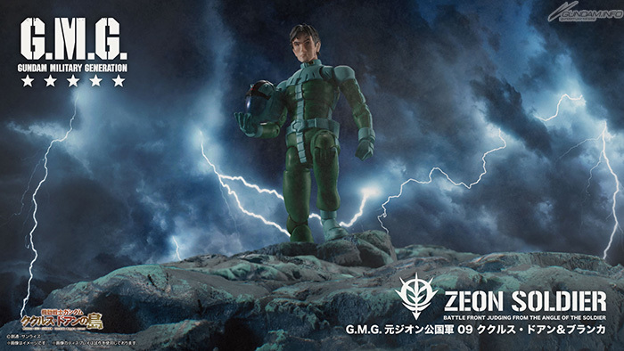 「G.M.G 原吉翁軍09 庫克羅斯·德安」將劇場版《機動戰士鋼彈 庫克羅斯·德安之島》重要角色 德安以約 10 公分的小尺寸精緻再現,身穿著吉翁君宇宙服也有精細的塗裝;人偶從頭部、雙臂、胸腰到腿部皆為可動規格,頭盔為可拆卸,並附有槍支、步槍、手部零件等。
