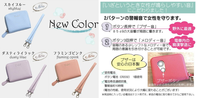外型上與一般的錢包並沒有太大差異,簡約裡頭卻藏有玄機,另一側藏有蜂鳴器,只要長押就能發出警報聲,發出大聲響能讓人遠離犯罪可能。而連續按三下按鈕則可以發出旋律音效,適合在室內使用,推薦使用的場所是電車內擊退癡漢使用。