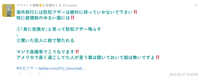 不過對於出國來說,有網友認為不應該使用蜂鳴器這樣的器具,有些國家能持有槍械的情況下,聽到類似警報聲的時候他可能會使用武器反擊,可能反而身陷危機。