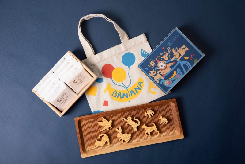 慶祝上市一週年,「山丘芭娜娜」在包裝、產品設計上均注入全新亮點,2023年限定精裝盒插畫,滿週歲的小猴首次露臉,更「蕉」了貓、狗、兔、鳥新朋友一齊慶生,俏皮又生動的插畫傳遞出「山丘芭娜娜」童趣的特色。《微熱山丘》更利用獨家水刀切割工法,將這幾款動物造型「杯緣子餅乾」隨機收入盒中,打造如同「盲盒開箱」般的驚喜體驗。開盒後,不同的動物造型餅乾,餐桌擺盤或掛在杯緣上呈現,如同把玩公仔或桌遊一般,無論是運用想像力創造出動物樂園的場景,或是另類的動物餅乾疊疊樂,多樣邊吃邊玩的樂趣體驗,都能與朋友們一起度過Have Fun 2gether的同樂時刻!