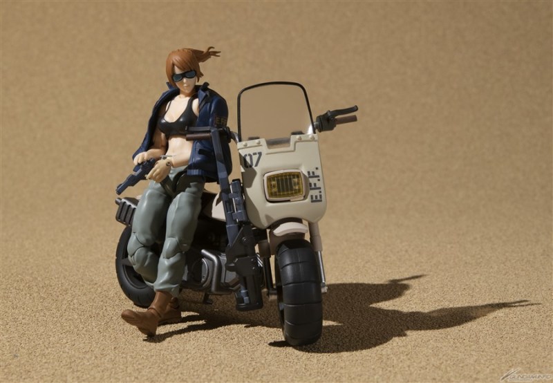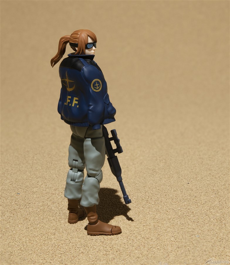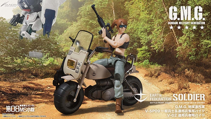 「G.M.G 機動戰士鋼彈 第08MS小隊 地球連邦軍V-SP09 一般兵士」,尺寸約高 10 公分,女士兵的穿著營造出從地上前線補給基地逃離的形象,穿著帥氣的黑背心,臉上戴著護目鏡;附有可以披在肩上的夾克以及手槍、步槍等武器和替換手部零件。同捆的連邦兵専用機車同樣採 1/18 比例,車身前後輪皆可轉動,附有可拆的前罩以及可加掛的步槍架。另外也附屬第 07MS小隊莎莉伍長的替換頭部,可以賞玩出不同的場面!