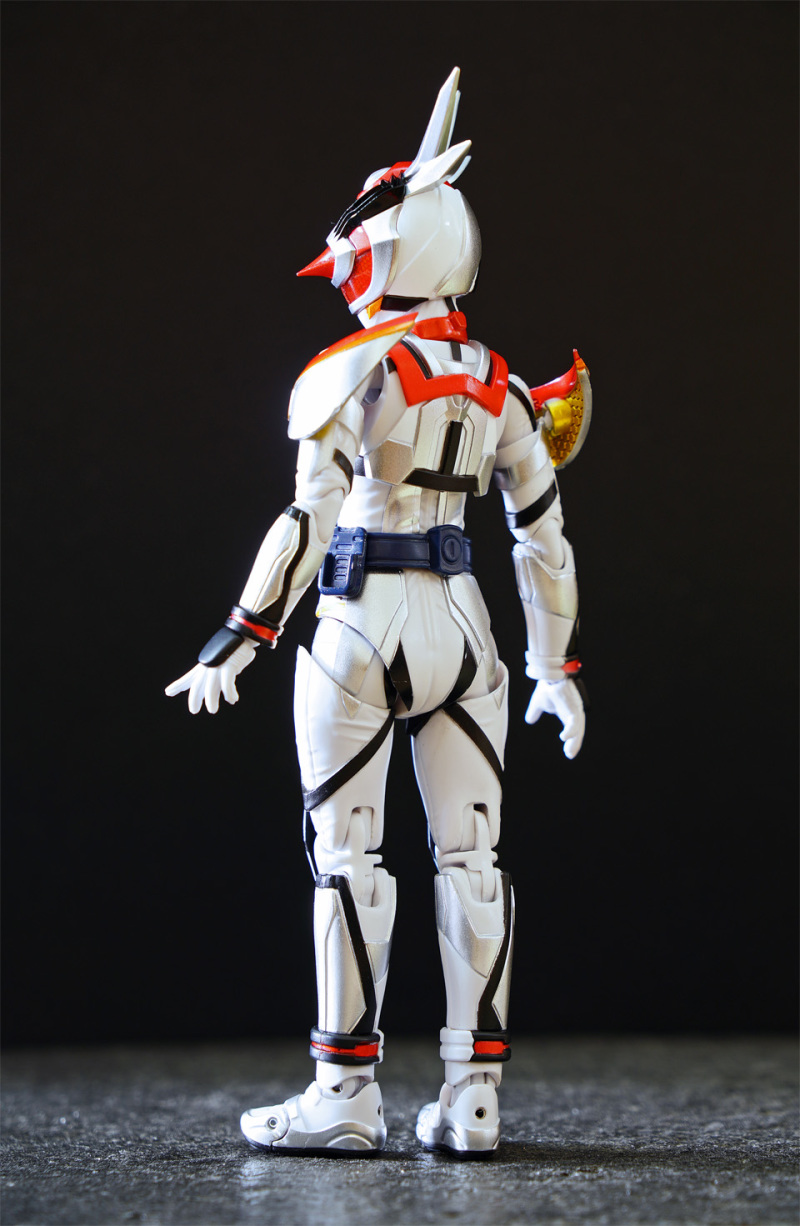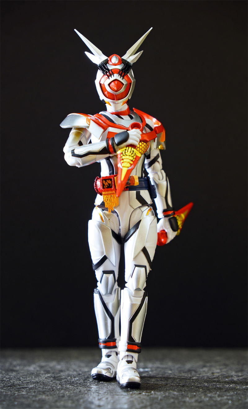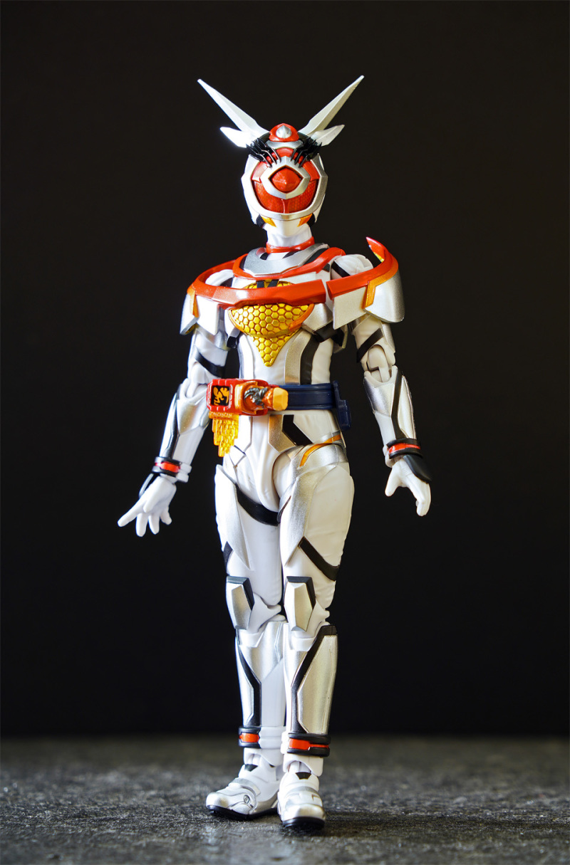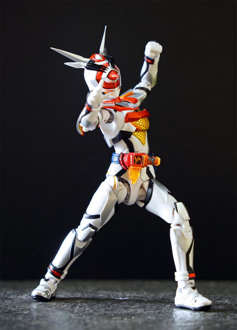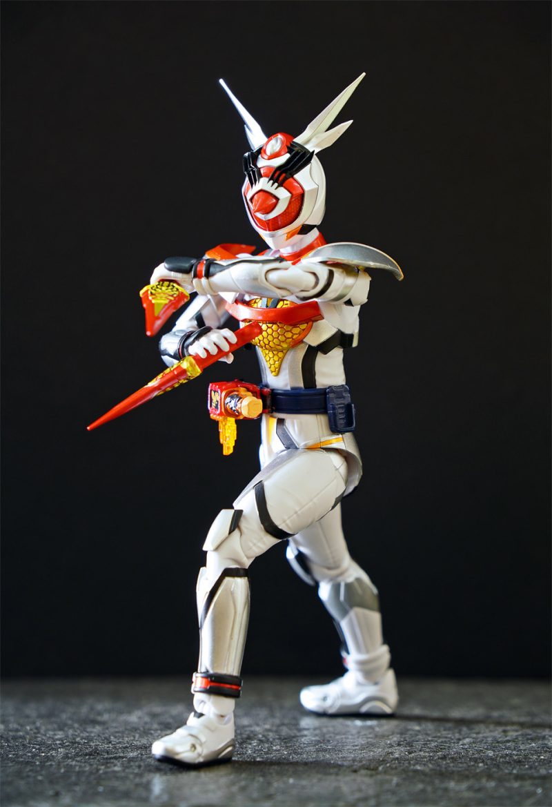 SHF 主體高約 145 mm,全身以白、橙、黑、黃色為為主。配件不多,主要是交換用手型及 1 對苦無 。相比其他幪面超人可玩性只屬一般!