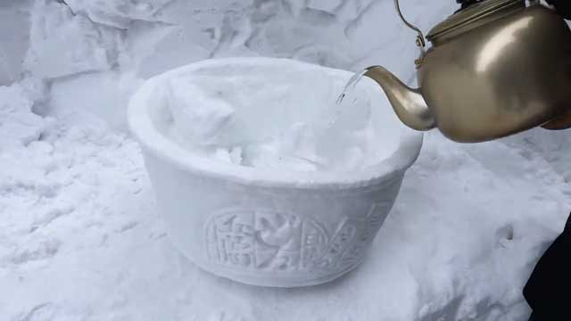 日清旗下品牌「咚兵衛」,其官方推特發布了一段短片,首先他們看到一個花五天製作的「咚兵衛豆皮烏龍麵」雪雕,那完成度非常高,只差不是真的,而這雪雕...他們要融化掉來吃!沒錯,你沒看錯,五天的心血就這樣被熱水給澆沒了!