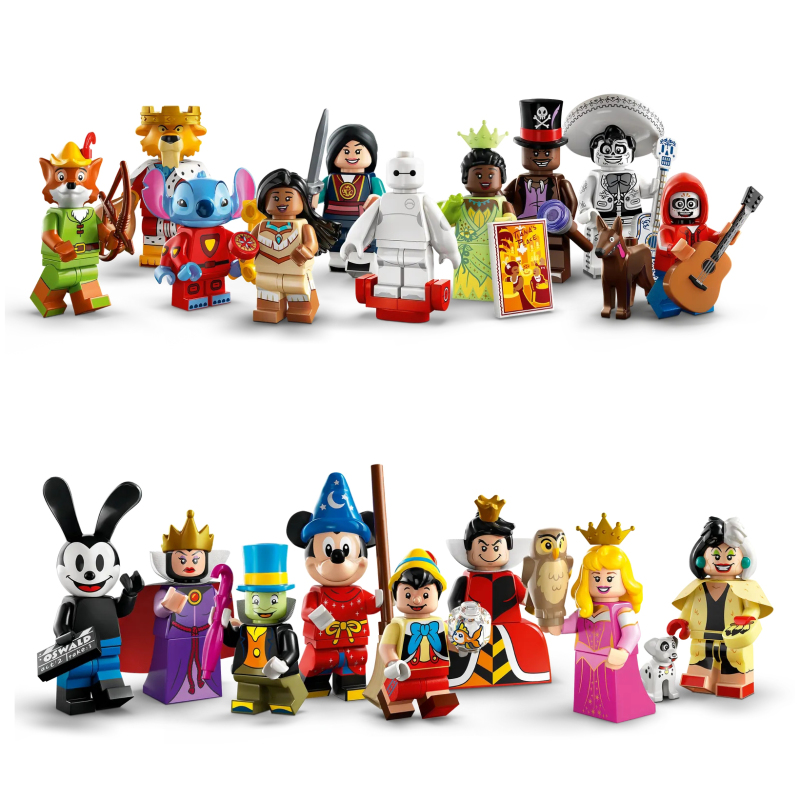 一反近期人偶抽抽包都是以 12 款為一套的規格,本次「71038 迪士尼 100」與早先推出的迪士尼人偶包第一彈、第二彈一樣都包含了 18 種款式可以收藏,除了以魔法師學徒造型、身穿橘色連身服裝再次登場的米奇、史迪奇之外,其他都是全新角色,不管是在樂高化之後的重新詮釋還是附上的配件內容都蠻不錯的,尤其是小木偶手裡的金魚連魚缸、花木蘭配備的蟋蟀印刷件都超可愛!來看看這次的所有角色陣容吧。
