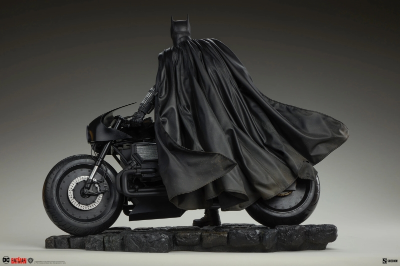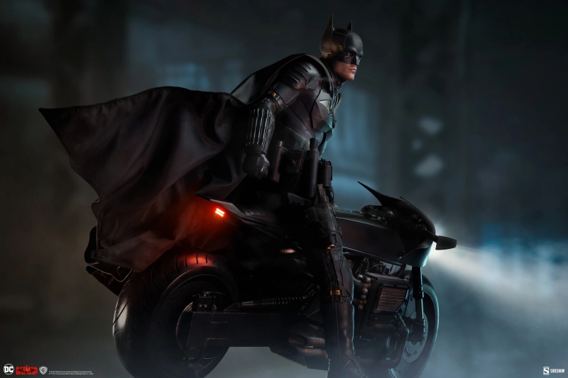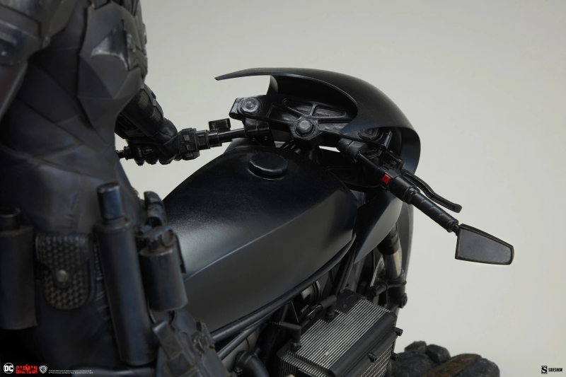 本作高約 48 公分,長度則來到 55.8 公分,展現出「蝙蝠俠」跨坐在蝙蝠機車上的帥氣姿態,不管是準備停車前往調查、或是正要上車啟程離去,這尊蝙蝠俠都能完美詮釋;本體再現了派汀森版蝙蝠俠的各處造型細節、胸口蝙蝠標誌、裝備於全身的武器,以及戴上蝙蝠面罩的面部輪廓,布料披風則在內部設置鐵線,可自由彎折出增添躍動氛圍的樣貌,蝙蝠機車也考究還原出細緻的機構、兩顆巨大的輪胎、特色的車頭......等,在車頭、車尾部分還有安裝 LED 發光功能,點亮之後更具臨場感。