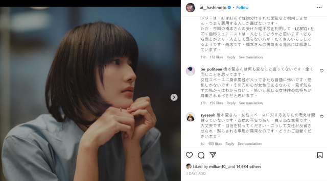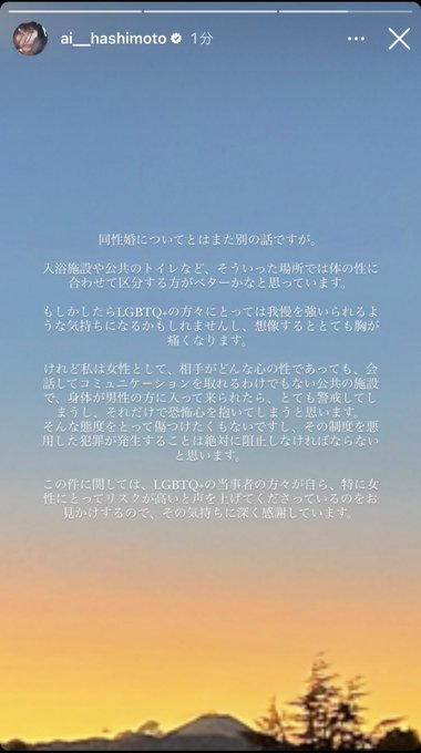 引發問題的起點是因為近日橋本愛曾在訪談中提到,自己對於公共設施的區分,還是應該按照身體的性別來分類比較好,自己對於如果在女廁或女湯看見跨性別的朋友,自己心理上會有一點不適,這樣的言論卻遭到 LGBTQ+ 群體認為不當。