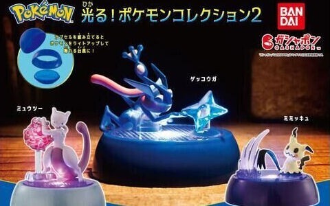 「GASHAPON 會發光!寶可夢收藏2」轉蛋,延續系列將角色模型結合轉蛋組合地台的展示方式,並在底座設計有燈光零件,增加寶可夢的招式魄力。第二彈收錄有超人氣的超夢、甲賀忍蛙、謎擬Q三款角色,使出必殺技的動作與表情都相當吸引人,從透明的招式特效件透出光效,就算是小尺寸也能展現十足架勢!