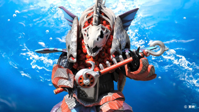 這個鮭魚怪人名為サーモン・シャケキスタンチン(沙蒙・雪克奇斯坦奇恩)是在《快盜戰隊魯邦連者VS警察戰隊巡邏連者》第 45 話-請期待聖誕節中登場的角色,雖然長得有點可怕,不過在作品中出現其實滿有趣的,對超級戰隊的粉絲而言應該不陌生 XD。