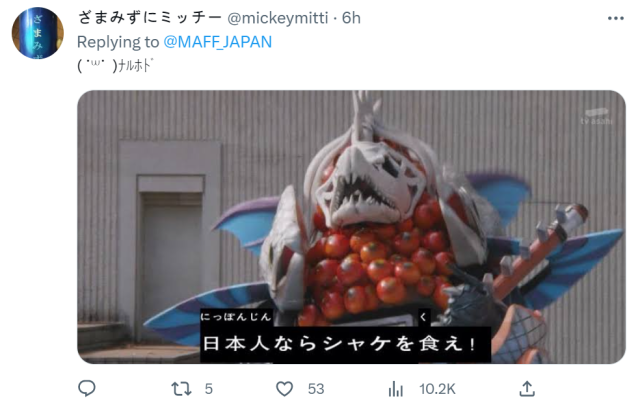 今日 ( 3/7 ) 官方推特上出現慶祝「魚之日」的發文,居然放上「超級戰隊系列」《快盜戰隊魯邦連者VS警察戰隊巡邏連者》 中出現的鮭魚怪人,立刻成為網友熱議話題,嘲諷說 : 「農林水產省推特被怪人入侵了嗎?」