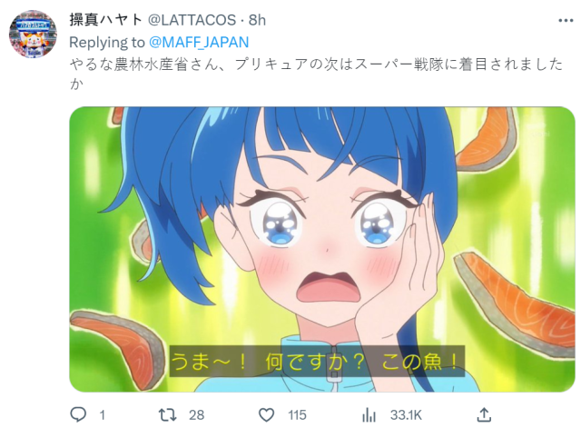 日本的政府單位-農林水產省,或許聽起來是很無趣的公務機關,但其實在推特上頗具人氣,先前曾力推遊戲《天穗之咲稻姬》為適合送給孩子的聖誕節的禮物外,更是《美味派對 ♡ 光之美少女》的最大狂粉,狂發推跟拍攝影片宣傳。