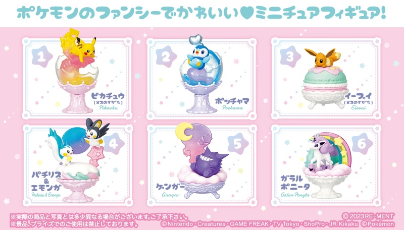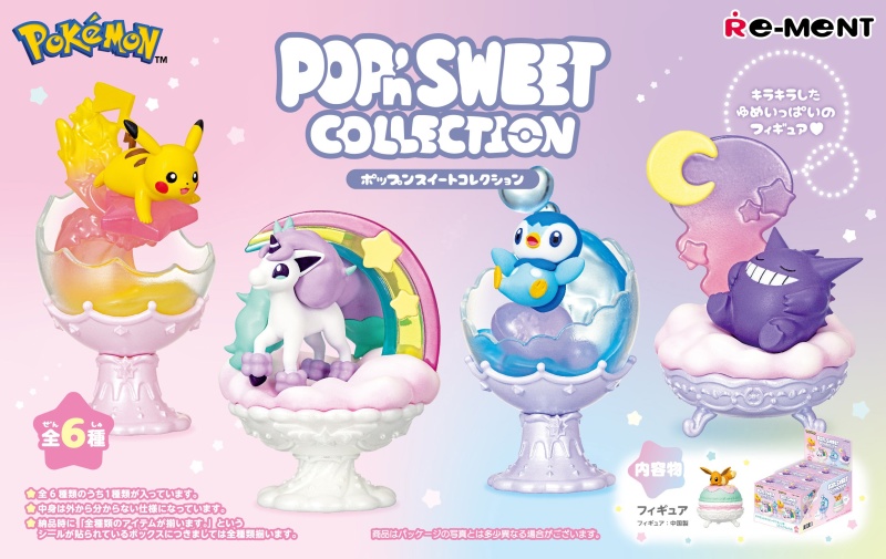 「RE-MENT 精靈寶可夢 POP'n SWEET COLLECTION」盒玩,以夢幻又甜美的色調打造可以在桌上擺飾的迷你場景,結合角色的特性,生動設計了六款精緻可愛的作品,陣容包含人氣角色:皮卡丘、波加曼、伊布、帕奇利茲&電飛鼠、耿鬼、伽勒爾小火馬,細緻的果凍、彩虹、馬卡龍等繽紛造型搭配粉嫩的珠光塗裝,擺飾起來超療癒!