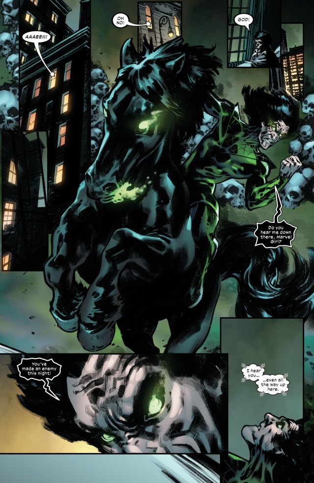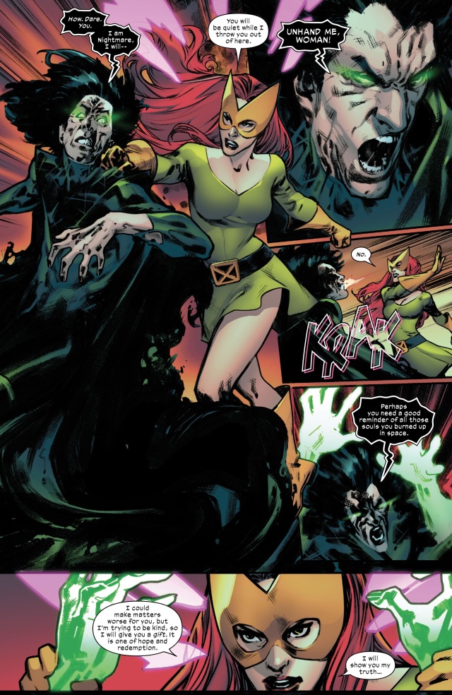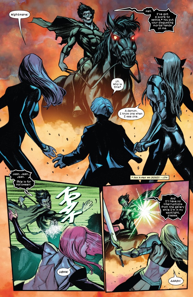 原來這要回顧到這部連載開頭的第四期。當時,夢魘試圖在萬聖節的晚上大鬧X戰警在紐約市的樹屋(Treehouse)總部,卻被驚奇少女用力賞了巴掌、痛扁了一頓丟了出去,這對它來說自然是無法原諒的奇恥大辱!