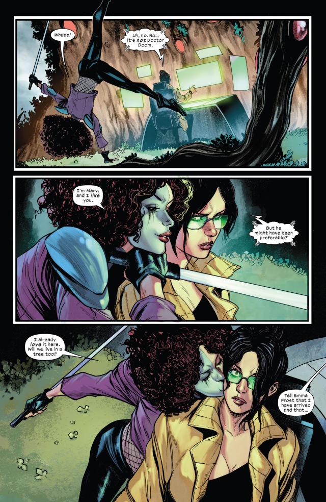 因為剛剛從傳送門上島的,並不是什麼末日博士一類的大反派,而是長久以來主要身為街頭反派的變種人「傷寒瑪莉」(Typhoid Mary),前來取得克拉科人的公民身分。更重要的是,跟她一起前來的那個男人的身分......