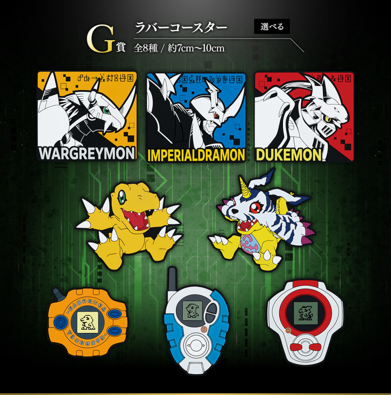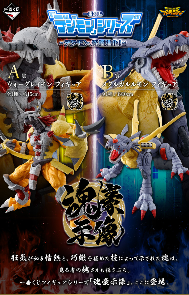 「一番賞~數碼寶貝、究極進化!~」,一共推出七種級別的賞品+最後賞,其中更收錄有寫實魄力的「魂豪示像」系列 A賞 戰鬥暴龍獸 、B賞 鋼鐵加魯魯獸、C賞 亞古獸&加布獸 ,精緻塑造爆筋與毛髮等逼真細節,滿身的刻痕線條更讓整體充滿氣勢!另外還有視覺板、毛巾、橡膠吊飾等豐富的賞品。