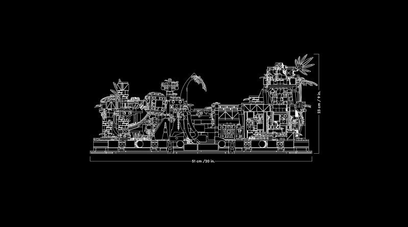 本作是由 1545 片零件堆砌出的中型遊玩場景,整體是依照《法櫃奇兵》電影剛開始的經典場面:位於秘魯、供奉著金像(Golden Idol)的神廟為題設計,可以看到展示金像的房間、必須抓著藤蔓才能順利跳躍過去的巨大坑洞、巨大滾石的通道......這幾個標誌性的元素,夾雜著植物的樣貌、表現出當地信仰的石像裝飾也很不錯,除了可以讓滾石落下之外,轉動底座的旋鈕也可以觸發石門、金像、藤蔓......等的機關!另外,這個場景還結合了《法櫃奇兵》電影主題的展示底座,可以看到電影 LOGO 跟印第、Satipo 的經典台詞(貼紙)。