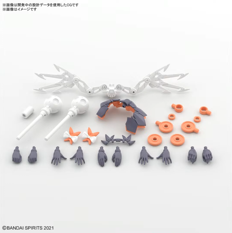 雖然造型相比前作涅瓦麗雅有點個性不足,不過具備特色的骷髏造型武裝,在背部裝備了一對銳利的骨骼翅膀,手持一對骷髏造型的棍棒。包含翅膀、裙襬都是可動式設計,降低腿部的可動干涉。而兩把骷髏棍棒更能使用連接零件組成雙頭棍。