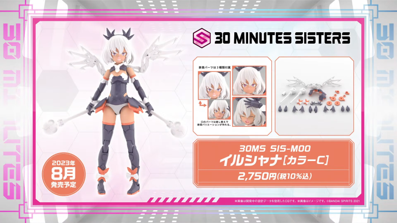 由日本模型商 BANDAI SPIRITS 公司 HOBBY 事業部所推出的原創機娘組裝模型『30 MINUTES SISTERS(組裝少女輕作戰)』系列繼涅瓦麗雅後,再度發表了以小惡魔主題的全新美少女「伊爾莎娜[配色C]」預計於 2023 年 08 月發售的消息。