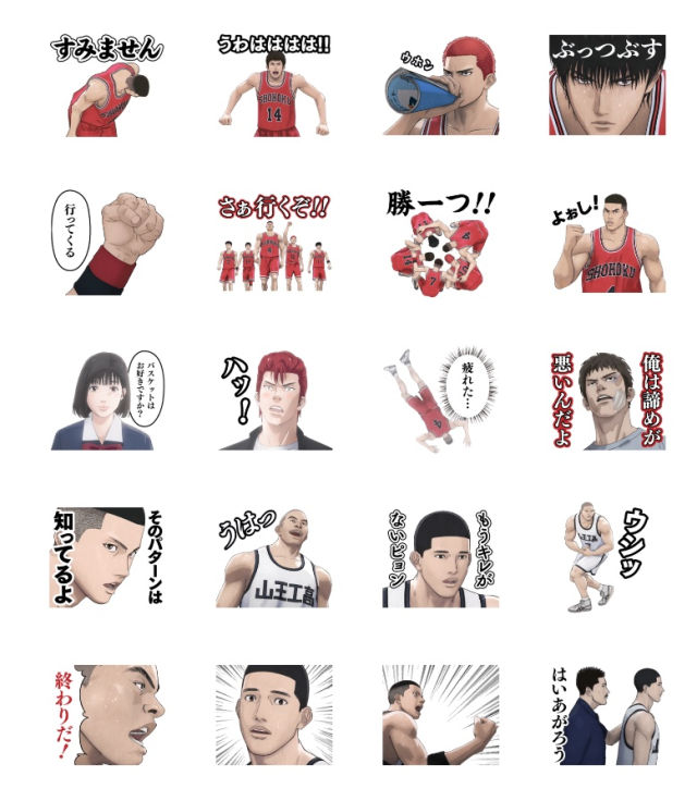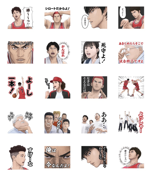 這次收錄的貼圖組合,包含各人物的經典台詞,不只是球場上的湘北五人,連山王工業的球員與旁邊湘北加油團與板凳球員、安西教練、經理彩子等人出現在其中,光是看到這些畫面,應該都讓不少有到戲院觀影的朋友回想起電影的片段。