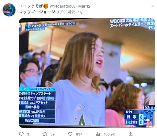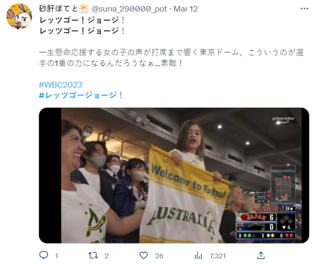 由大聯盟 MLB 主辦的 WBC 世界棒球經典賽,這兩周於台灣、日本、美國三地展開分組預賽,也是最近日本民眾十分關注的話題。我們近日介紹了關於經典賽日本武士隊進場音樂以及義大利隊休息區有擺設「咖啡機」之外,小編要來介紹的是在日本與澳洲的比賽中,導播拍到加油區一位三歲的少女穿著澳洲衣服替他們加油,可愛吶喊的模樣擄獲了眾人芳心,更成為推特上不少網民熱議的話題。