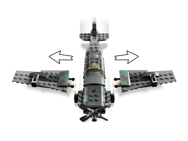 這一款由 387 片零件所構成的「載具+人偶」組重現了《聖戰奇兵》中的經典追逐戰,內容包含瓊斯父子檔開著復古雪鐵龍 11 Légère 敞篷車與駕駛戰鬥機的德軍飛行員,敞篷車部分再現了黑灰白配色與車型線條,擋風玻璃則是以帶有四個顆粒點的長方形框架零件表示,戰鬥機部分同樣還原了灰綠的配色方案、螺旋槳、透明駕駛艙頂蓋,可在尾翼部分則是將原先的納粹黨符號消去,除了位於兩側機翼的子彈發射裝置之外,機翼更可以輕鬆拆卸,還原電影中戰鬥機衝進隧道、結果兩翼直接被撞爛脫落的狀態。