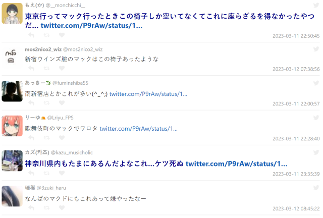 這也讓不少網友反應其實東京不少麥當勞都使用這種椅子,甚至到了大阪也會見到,真的是非常莫名的設計,難坐又很詭異。