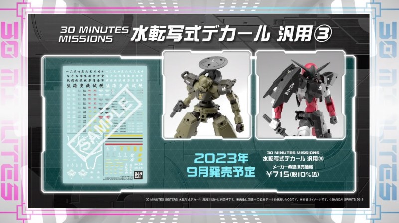 印有各種漢字、標誌、線條圖樣的通用水貼紙第三彈,能夠搭配另售的 30MM 系列機體使用,增添機身表面的細節造型。