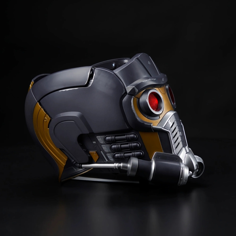 本次依照 MCU 電影設定打造的「星爵頭盔」充分再現了金、銀、鐵灰色的搭配與雙眼位置十足搶眼的紅色鏡片,嘴部帶有氧氣淨化的過濾器、側邊位置的機械結構與外側的管狀構造也考究還原,遍佈各處的舊化刮痕也加強了馳騁星際間作戰的氛圍,從官圖來看,這款頭盔是以上掀方式進行穿戴,先去染個跟星爵一樣的髮色、購入同款酒紅色皮衣,戴上頭盔之後不說真的沒人知道你不是星爵!