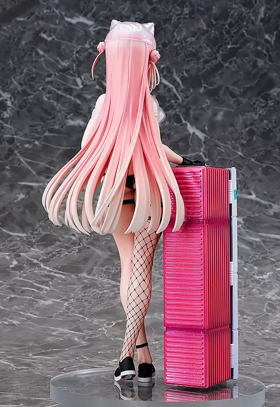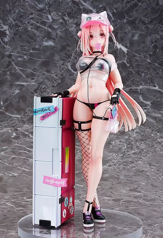 「UKM-2000 酸甜水物語」1/7比例模型,尺寸全高約 25.5 公分,將遊戲中的「酸甜水物語」立繪立體化,還原繪師 DSmile 繪製的泳裝造型,大膽露出健美身材,上身的白色T恤採用透明材質製作,呈現出因弄濕而透出比基尼的模樣。飄逸的粉紅色漸層長髮,極光色的貓耳帽與嘴上的口香糖泡泡等,施以繽紛色彩;在肌膚的塗裝也展現柔軟的質感,咬肉的細節與身材線條都相當迷人!