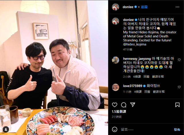 日前小島秀夫與馬東石,都分別在他們的Twitter與Instagram上分享了彼此的合照,在小島的推文更是亮出擔任主演的馬東石親自簽名的韓國犯罪動作電影《犯罪都市》(범죄도시)的影碟。