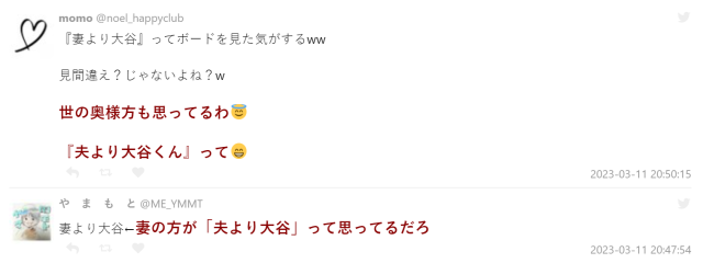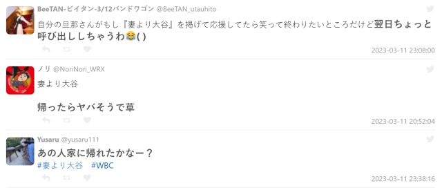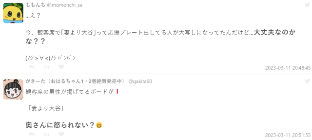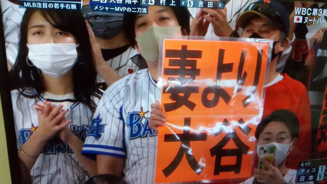 由大聯盟 MLB 主辦的 WBC 世界棒球經典賽,這兩周於台灣、日本、美國三地展開分組預賽,也是最近日本民眾十分關注的話題。這次比賽的關注點也在日本旅美好手-大谷翔平回到日本參加國際賽,更是吸引大量球迷進場支持。不過在日本對上捷克的比賽時,有觀眾席的球迷高舉「大谷比我妻子更好」&「翔平比我妻子更好」( 妻より大谷 & 妻より翔平 ),這強大的應援語也瞬間成為網路話題,更成為了推特上的流行語。