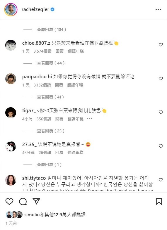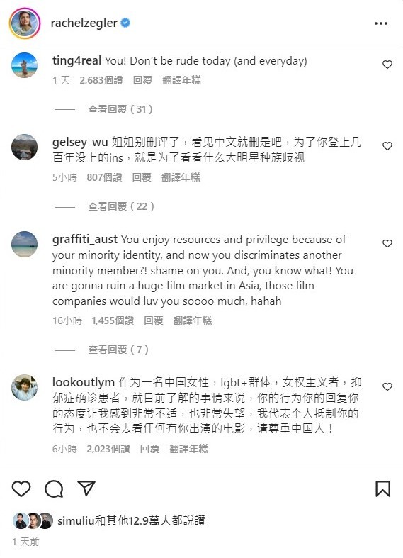 這位頻道主的控訴影片吸引兩百多萬人點閱,大批因此不爽齊格勒的中國網友便群起圍攻齊格勒的 Instagram 留言區砲轟(見上方截圖),怒指她「歧視亞裔」,有人亦酸溜溜地開嗆:「姐姐別刪評了,看見中文就刪是吧,」「不是趕上美國政治正確你給你糖爹洗一輩子皮炎也演不上主角,你真當自己是根雞毛了,向性少數群體道歉!向中國人道歉!向亞洲人道歉!」